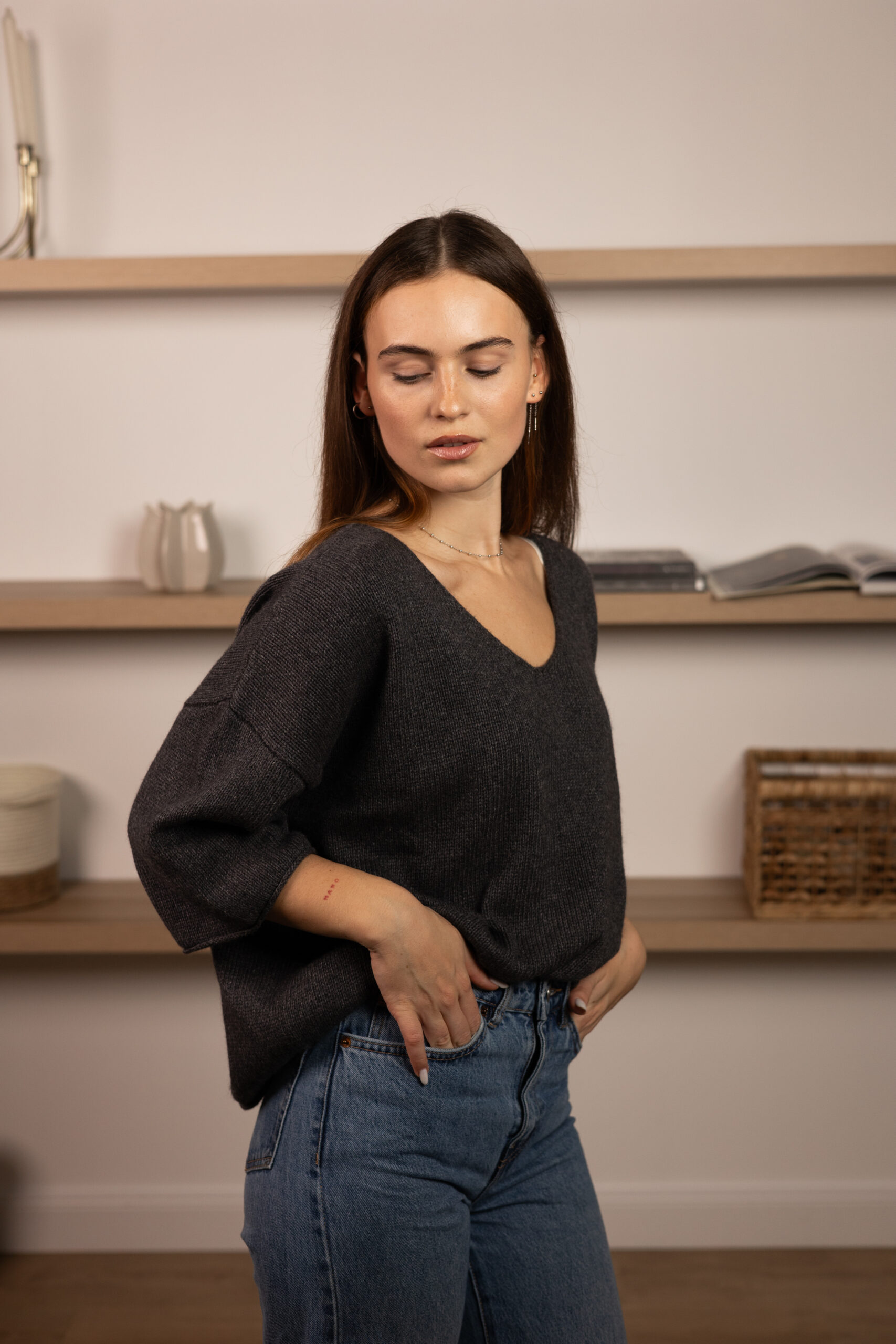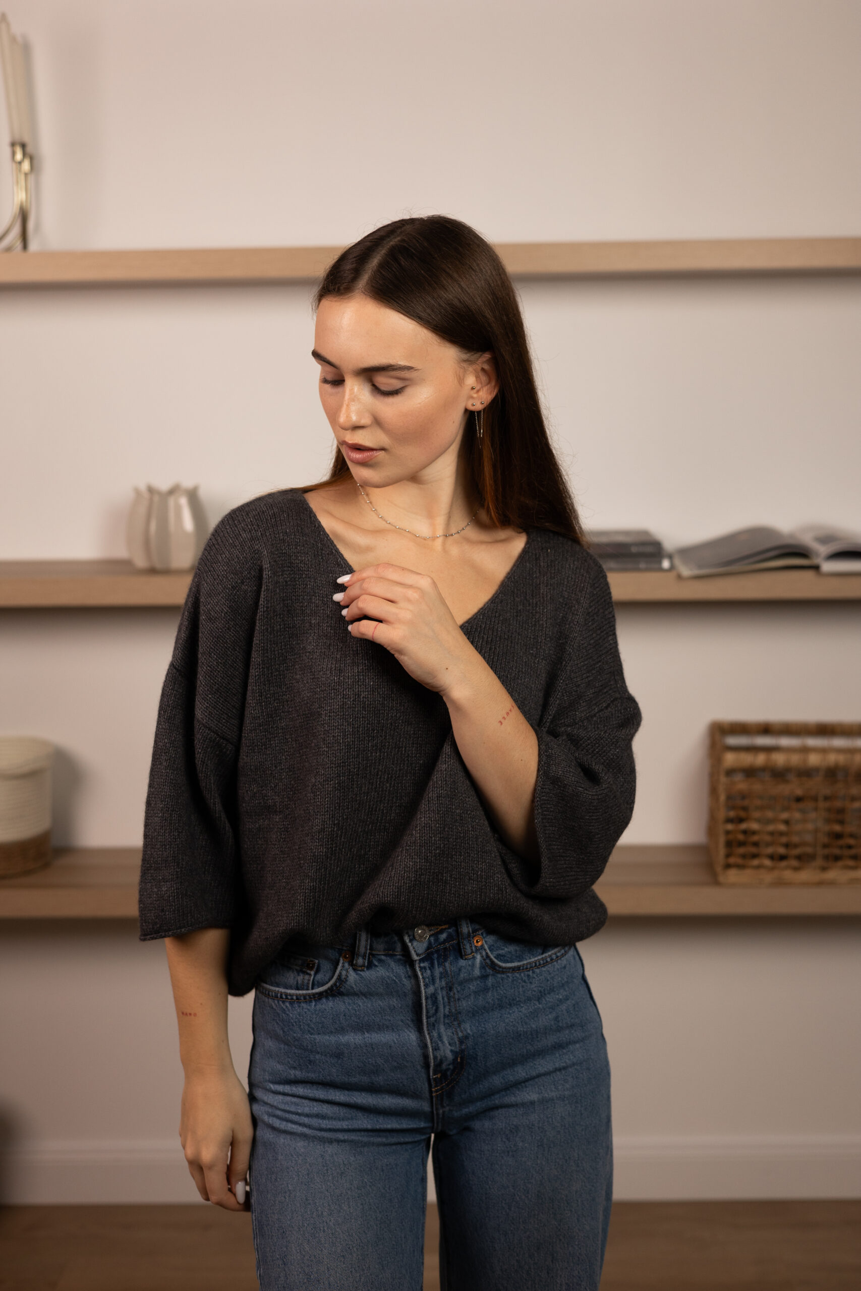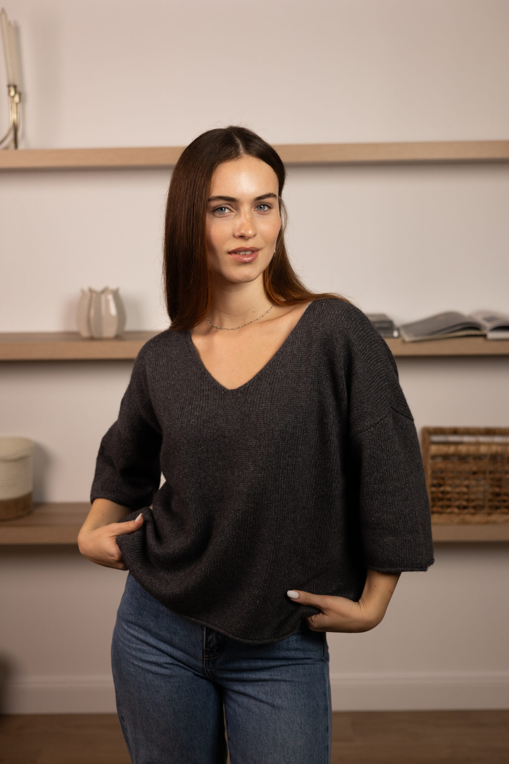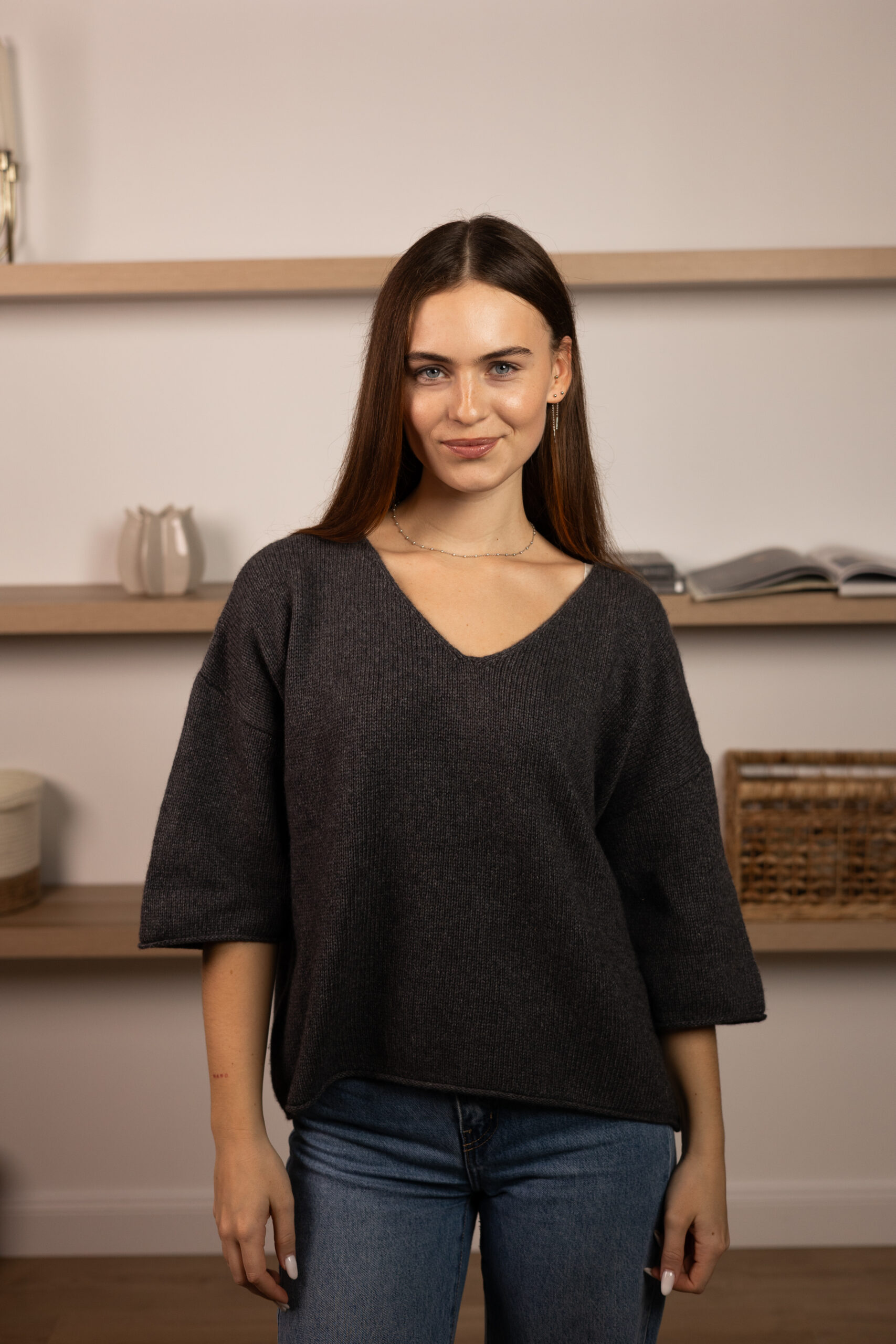 Unikalus, laisvo stiliaus megztukas trumpomis rankovėmis iš kašmyro ir šilko. Skirtas vertinančiai kokybiškus ir išskirtinius gaminius. Megztas iš itališko kašmyro su šilku siūlų. Labai švelnus, minkštas ir šiltas. Tobulas siūlų derinys leidžia sukurti išskirtinės kokybės megztuką alsuojantį prabanga ir kokybe. Kašmyras suteikia gaminiui prabangą, šilkas – subtilų žvilgesį ir malonų pojūtį.